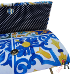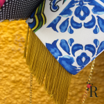 Azulejos que nos transportan a un antiguo patio andaluz, lleno de color y alegría. ¿Te imaginas un total liso y esta maravillosa cartera? Además está flecada en uno de sus laterales con fleco oro viejo de unos 8cm de longitud.